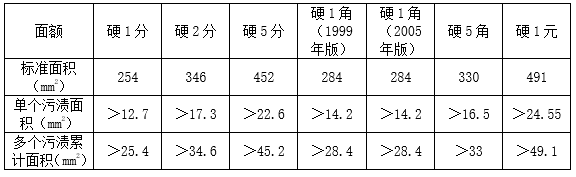 1.币面单个污渍面积大于标准面积的5%,或多个污渍累计面积大于标准面积的10%;