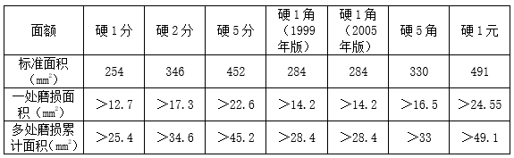 1.币面出现一处磨损,深度大于0.1mm,磨损面积大于标准面积的5%;