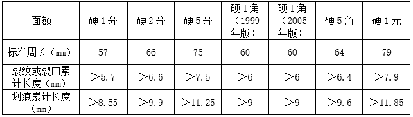 1.币面边沿内出现裂纹或裂口,径向深度大于1mm,单个裂纹或裂口长度超过3mm,且累计长度大于标准周长的10%;