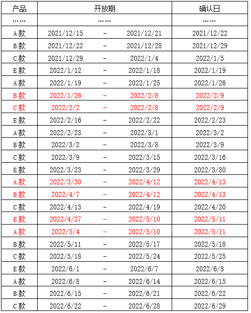 2021年12月-2022年上半年我行创鑫对公35天开放式理财产品的开放期情况如下: