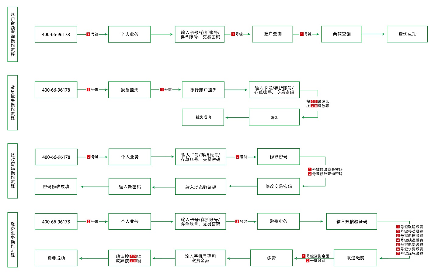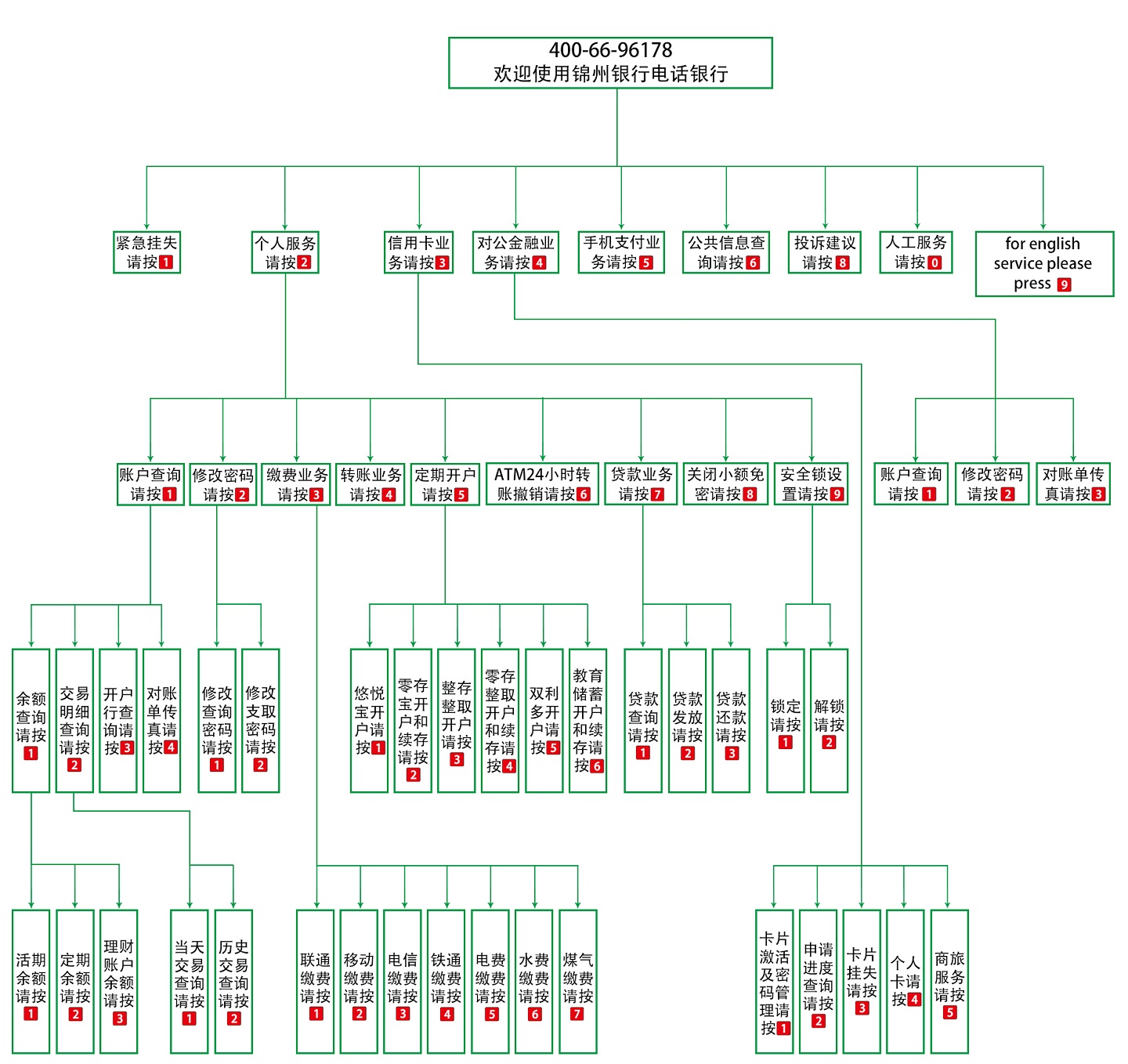 使用方法:客户只需拨通锦州银行客服热线400-66-96178(锦州地区拨打96178)即可进入电话银行或转入人工坐席服务。
